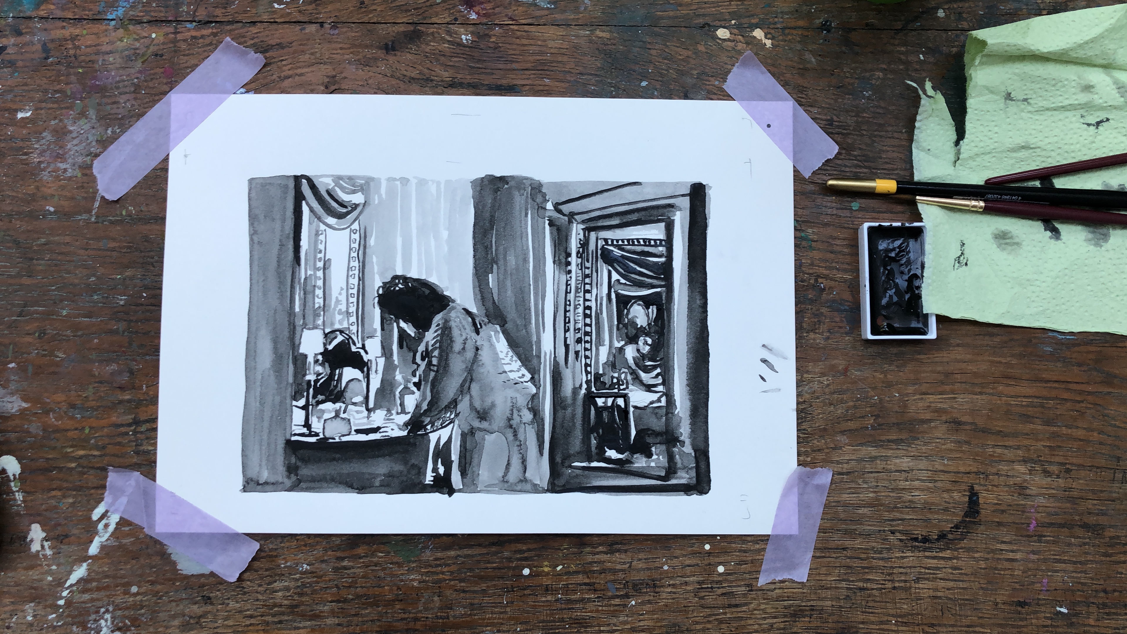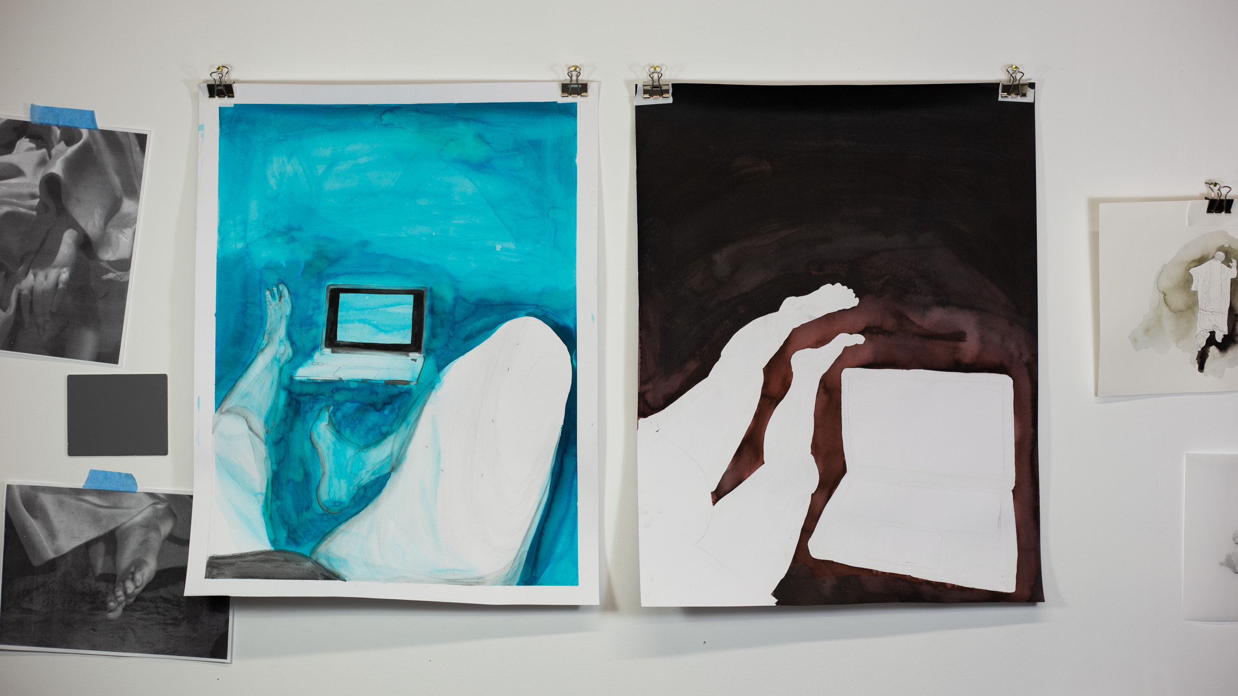 Her wallowing exacerbates the confinement of quarantine and I draw it out, literally with ink and paper. The scale of the studio engulfs both me and the materials I have brought. I again change my orientation to sit on top of the table rather than seated at it and make a resolution to buy larger paper when I leave the studio.
