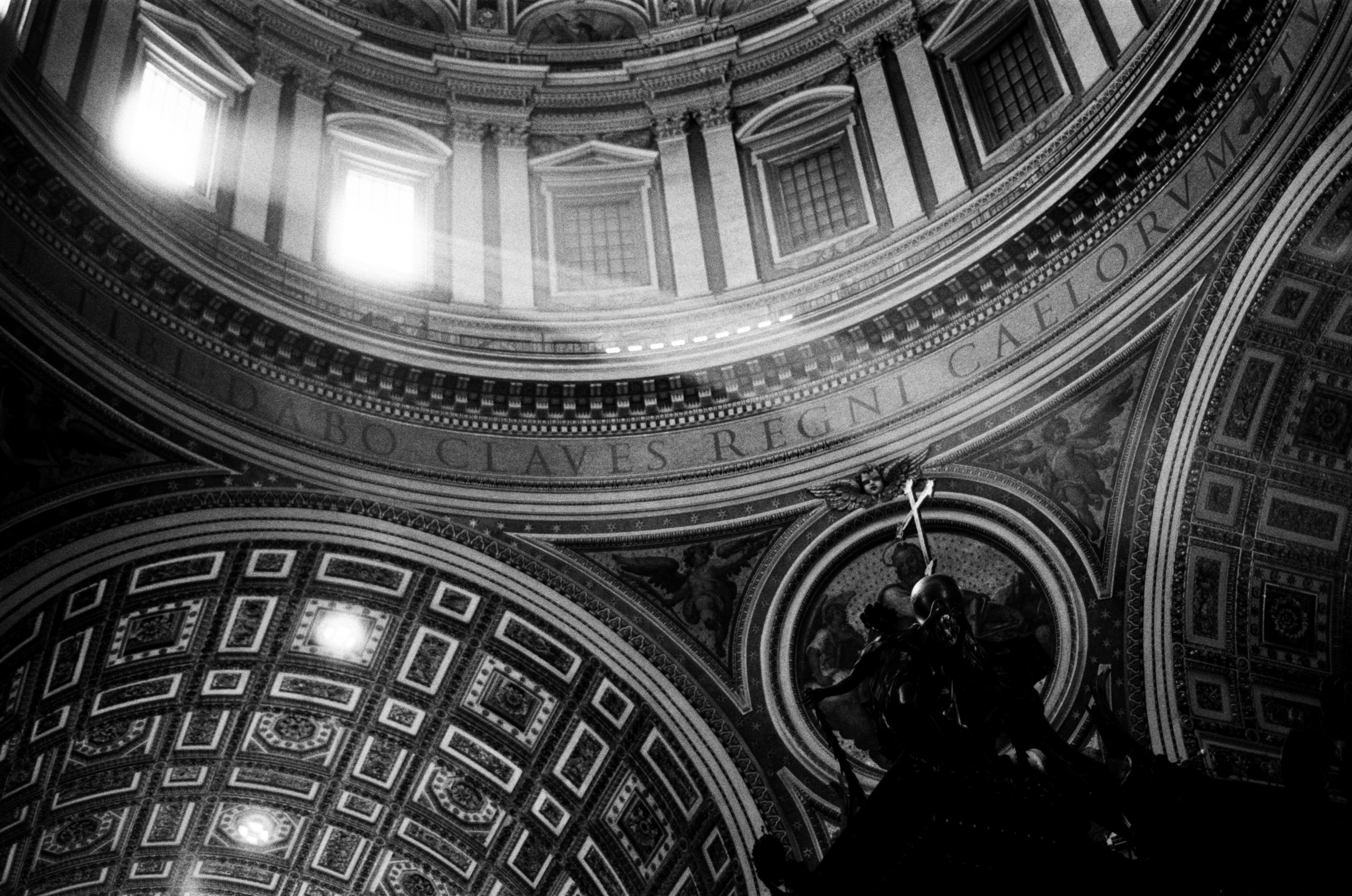 Another day I make a trip to see the The Ecstasy of Saint Teresa only to find her in restoration. I can just make out the folds of her robes behind the scaffolding. Or is that a dust sheet? Illuminated by natural light conducted down a hidden recess. The light reflects off gilded stucco rays.