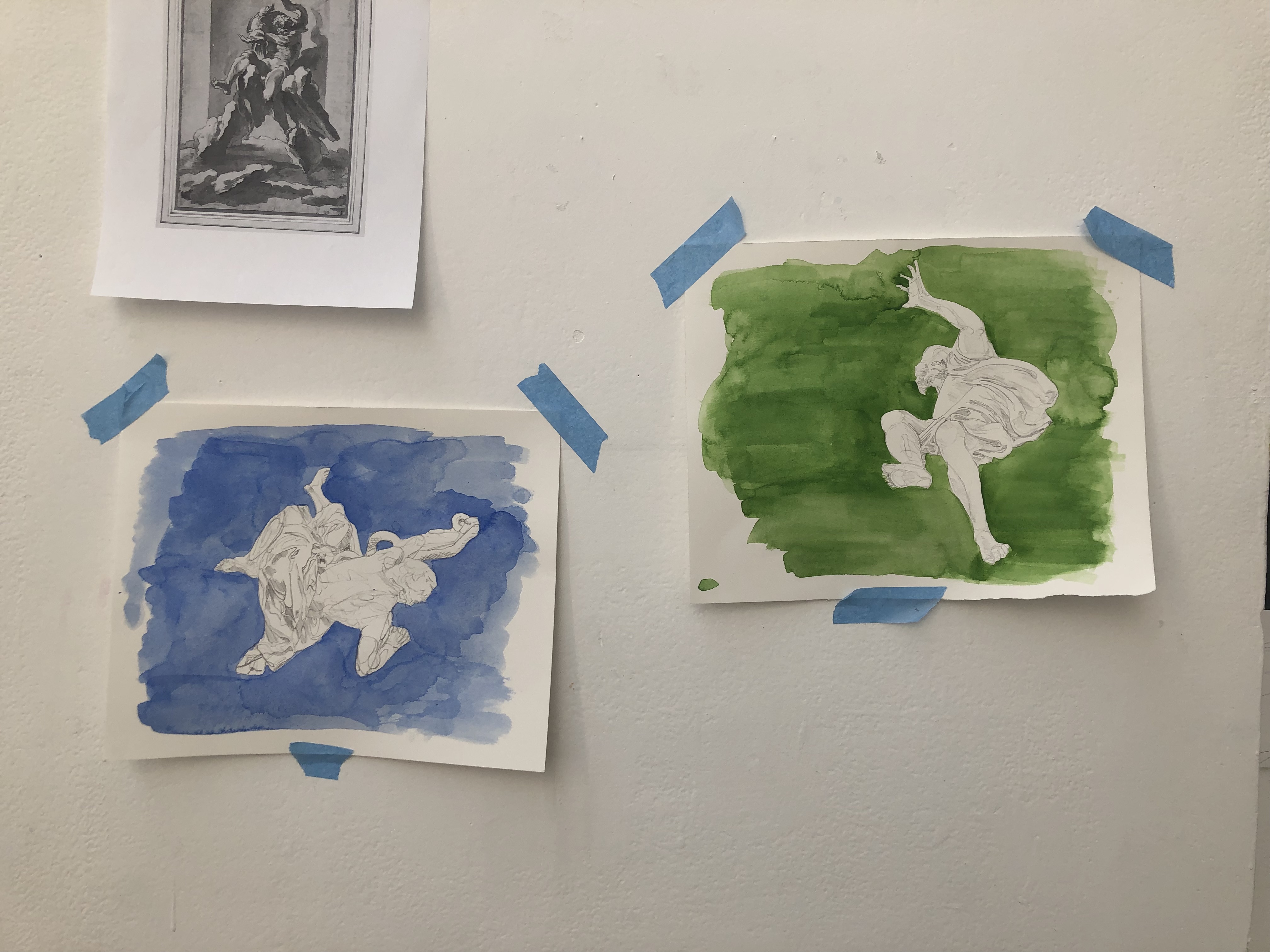 I spent the afternoon drawing bodies of Bernini sculptures from library books. Liquid forms of flesh rendered in stone then photographed, reproduced and here I turn them back into lines again. I leave the bodies adrift in coloured voids as if potentially falling through blue skies and green screens.