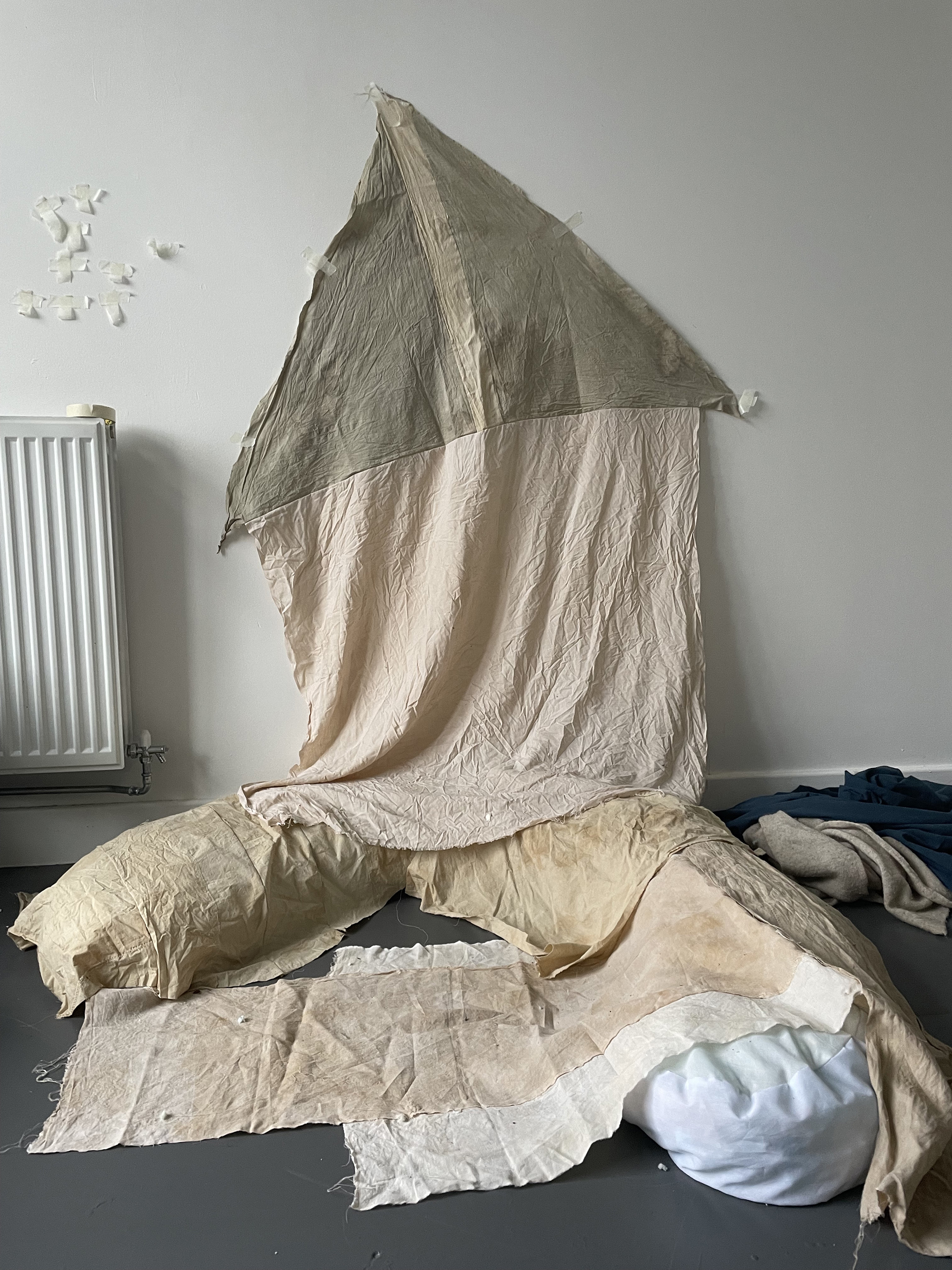 Image: Studio shot, work in progress, cotton and linen dyed with foraged weeds.