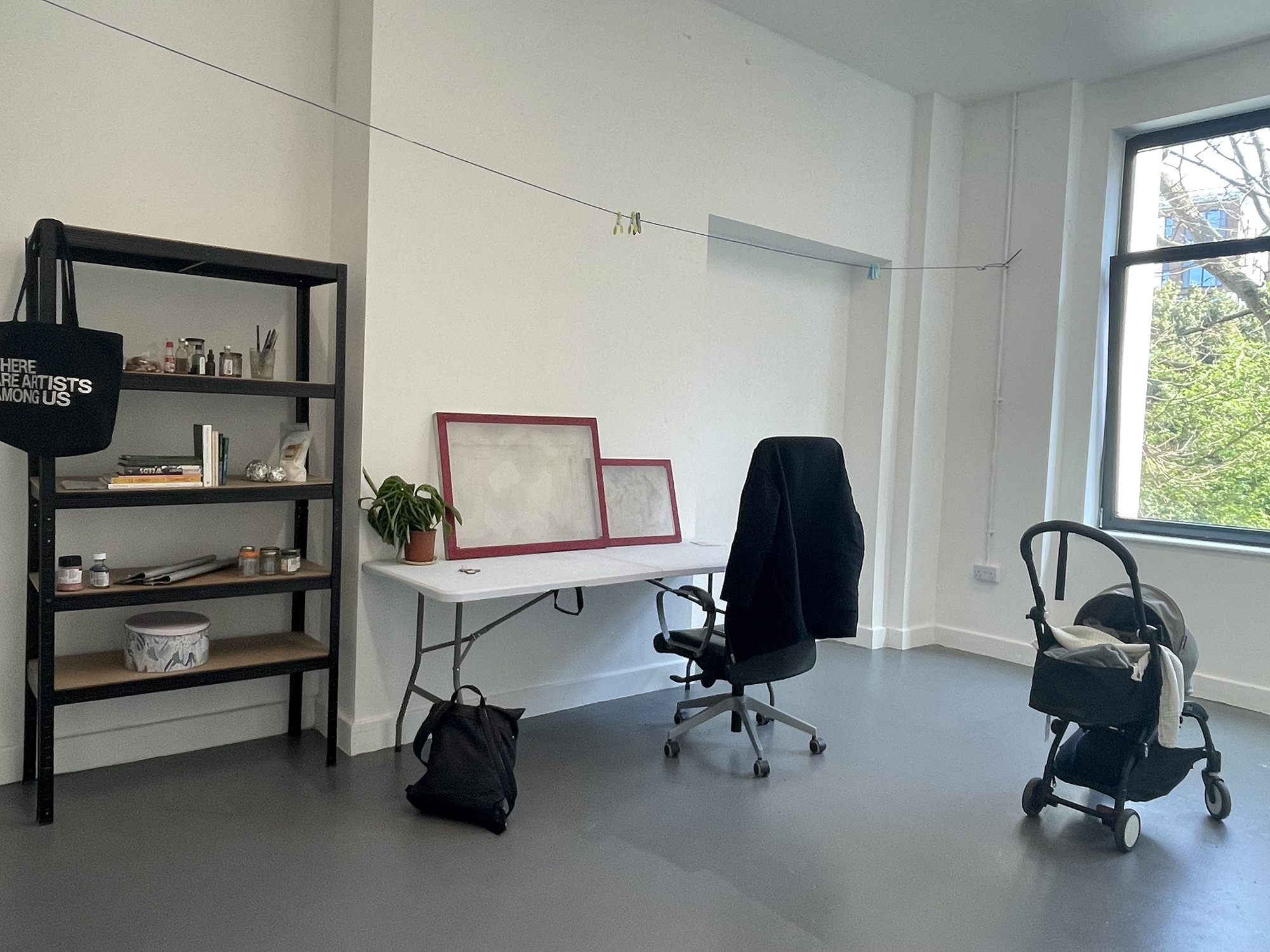 Determined to embrace interruption into my process, rather than maintain the well-rehearsed role of the lone artist, the first few months of studio work were a family endeavour. Packing for the day, my partner and I took Neve on the train. Once we arrived our responsibilities split: he was the carer and I worked, watching them goofing around on the large blanket we laid in front of the window. This family time was sweet. It allowed my partner to be with Neve without the usual daily hassles, and allowed me to feel like an artist and a mother, to feel that these roles are not in contradiction as I was told.