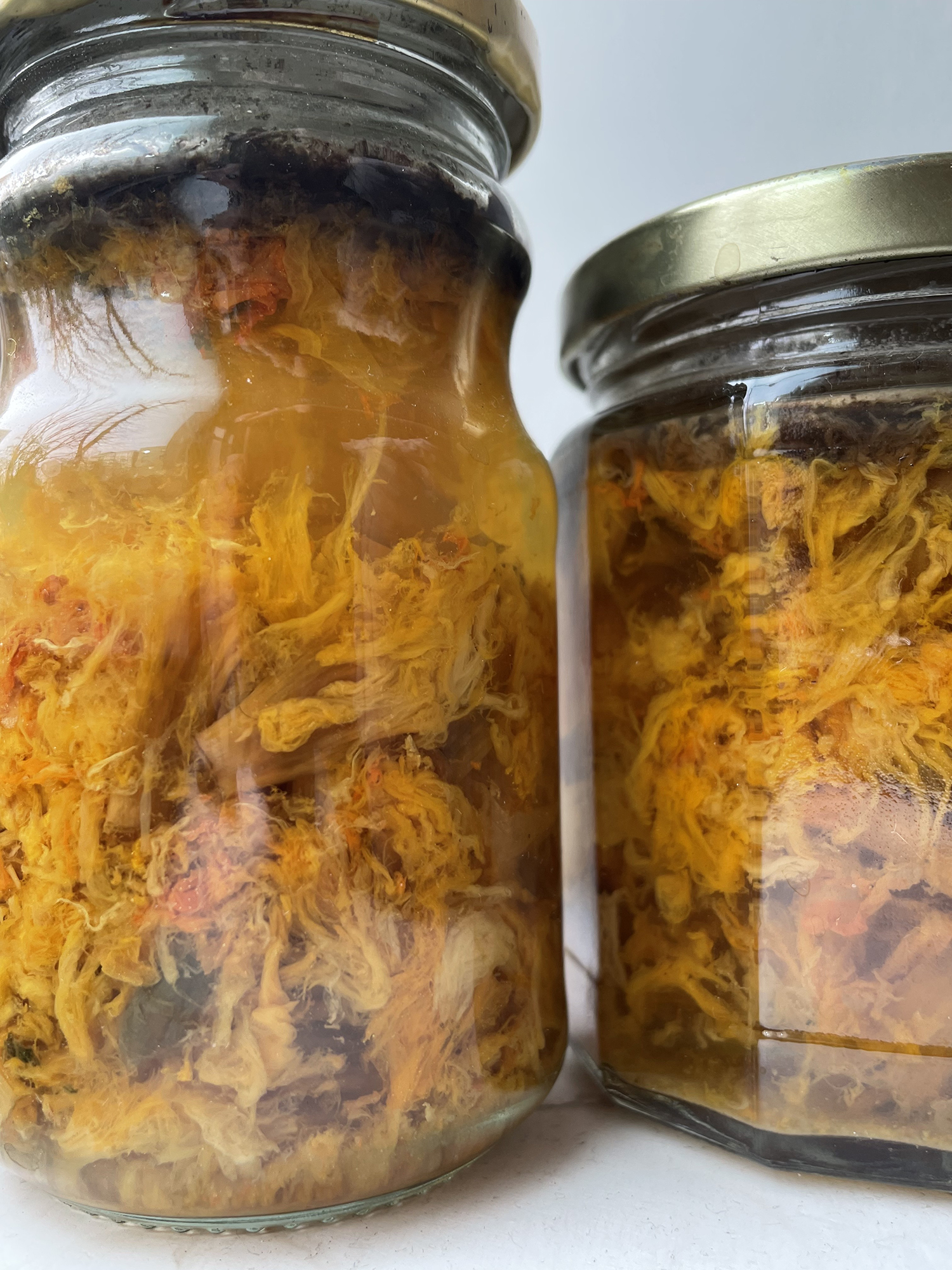 Image: Sun dye daffodil deadheads in jars.